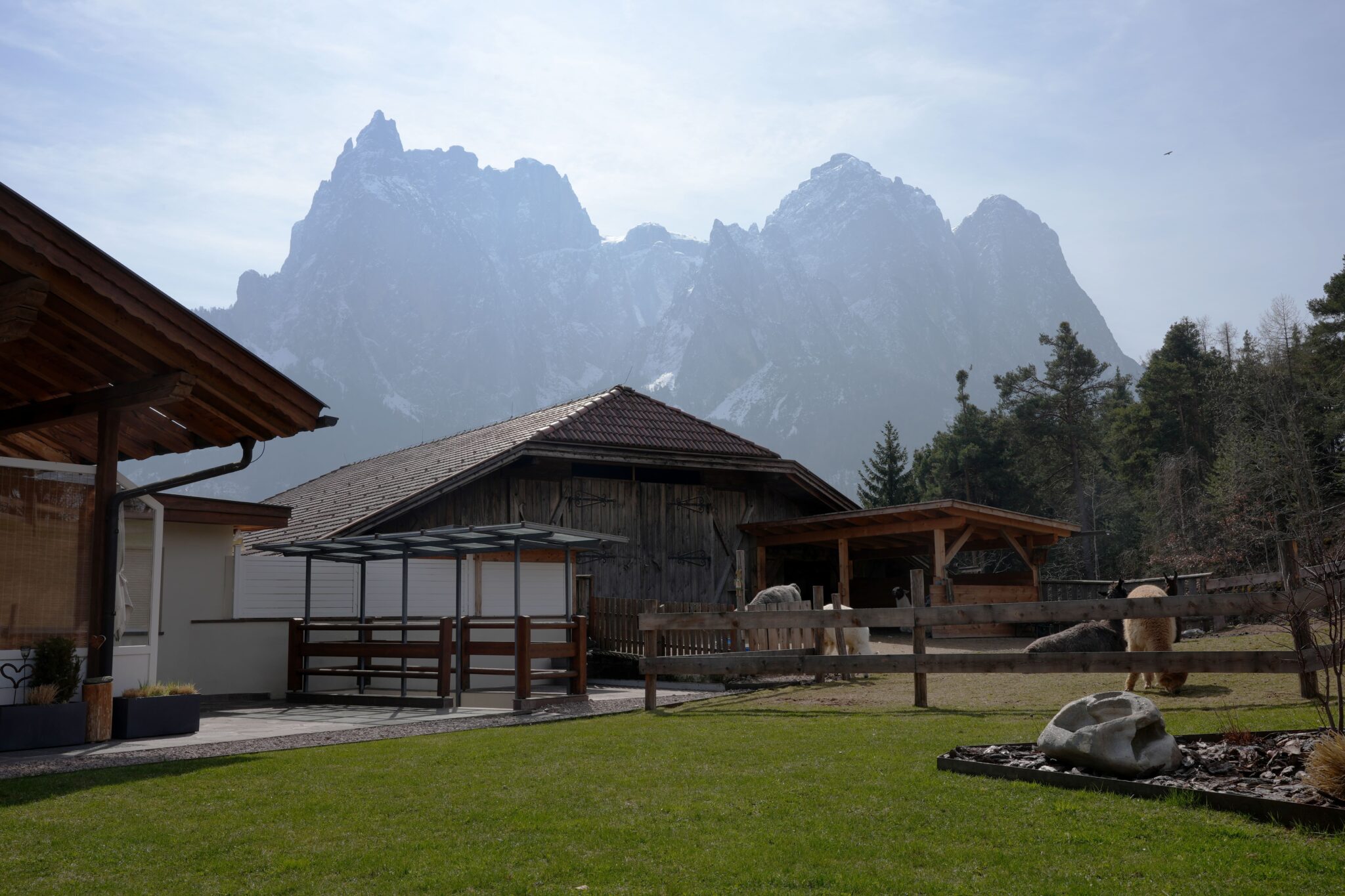 The apartment has a bedroom with a double bed. The kitchen living room is equipped with four hot plates, a dishwasher, a refrigerator with freezer compartment, a kettle and a coffee machine. Immediately adjacent is the living area with seating, TV, coffee table and safe. The bathroom has a rain shower, toilet, bidet and hairdryer. The terrace offers a view of our garden with the lamas and the Dolomites.