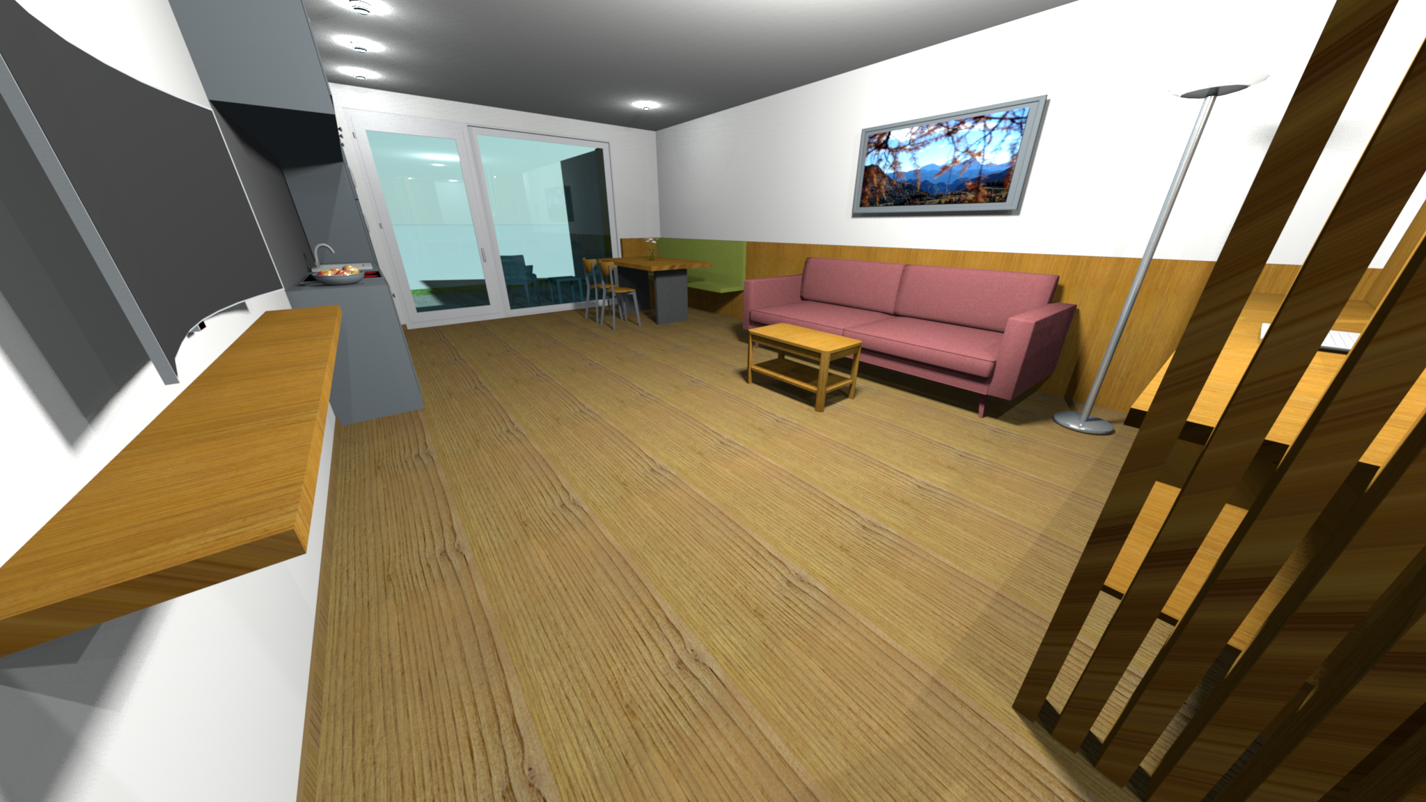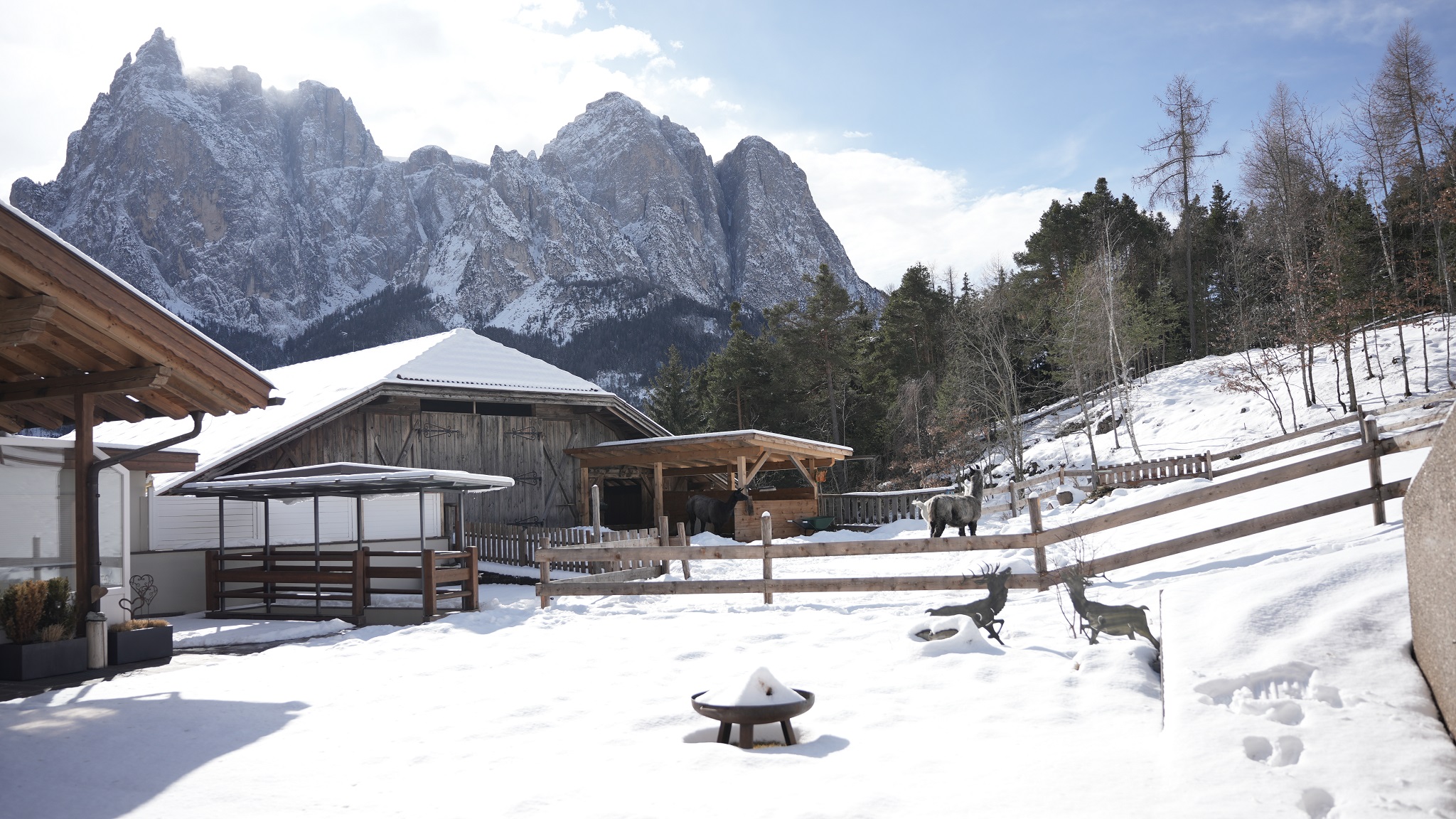 The apartment has a bedroom with a double bed. The kitchen living room is equipped with four hot plates, a dishwasher, a refrigerator with freezer compartment, a kettle and a coffee machine. Immediately adjacent is the living area with seating, TV, coffee table and safe. The bathroom has a rain shower, toilet, bidet and hairdryer. The terrace offers a view of our garden with the lamas and the Dolomites.